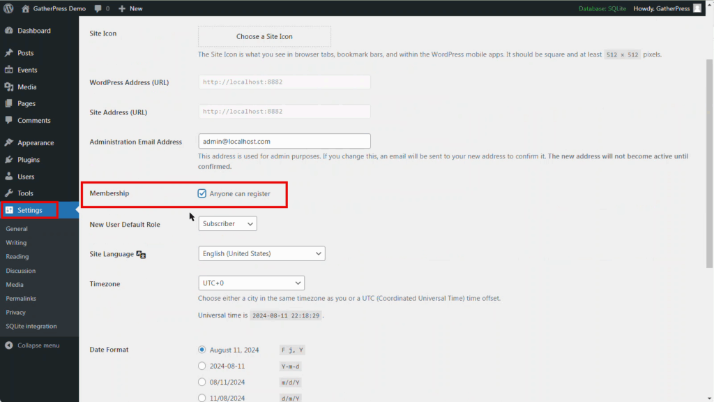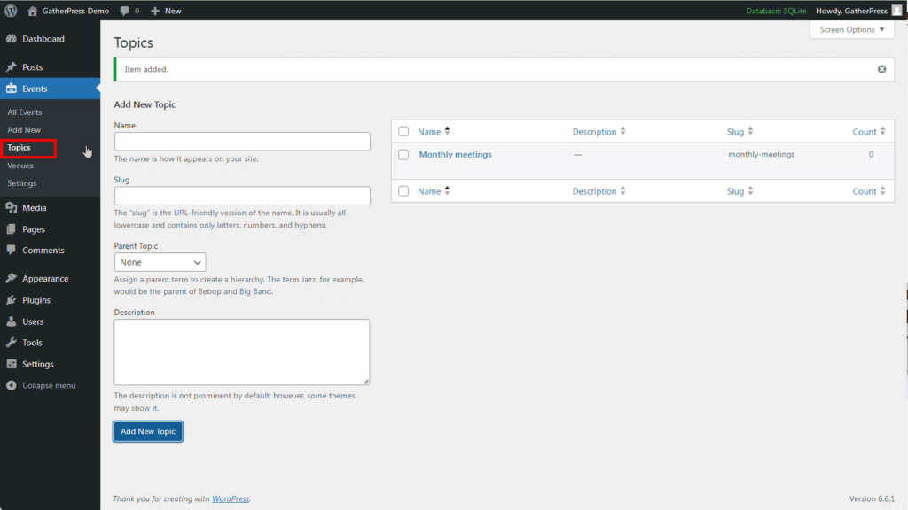 The easiest way to install GatherPress is by using the native Plugin Screen within WordPress.
