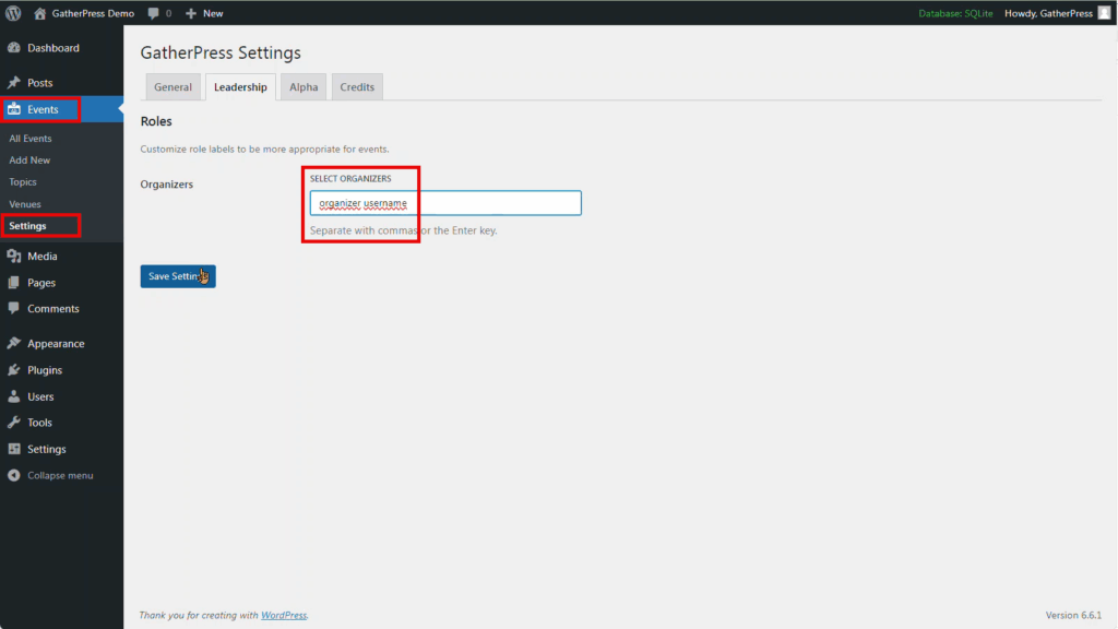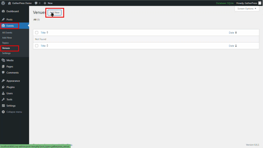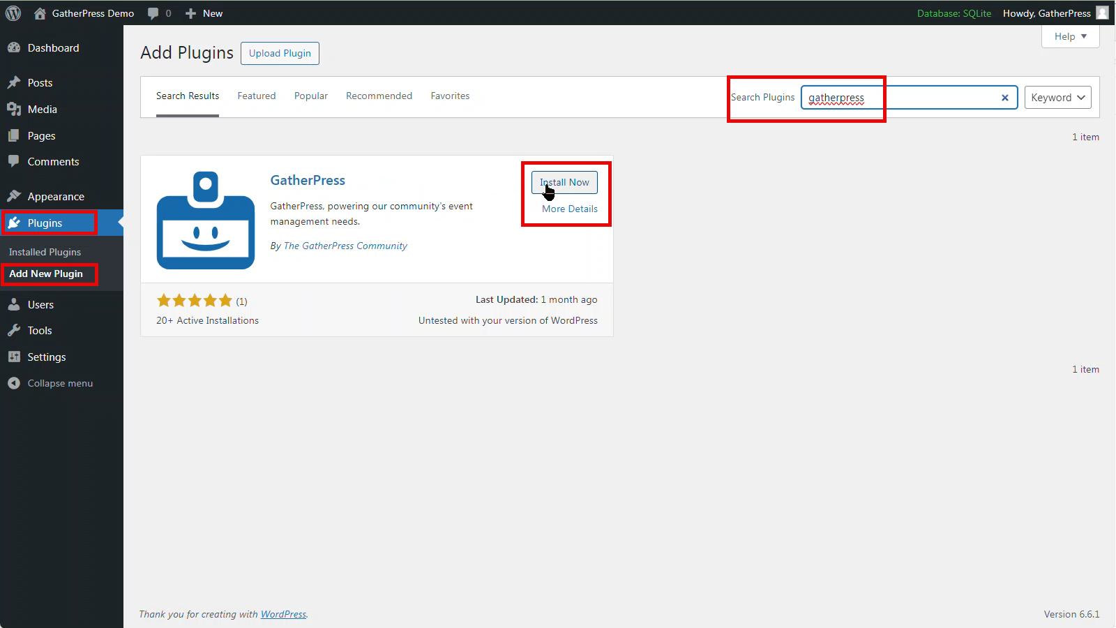To install, navigate to Plugins > Add New Plugin and then type into the search box GatherPress.